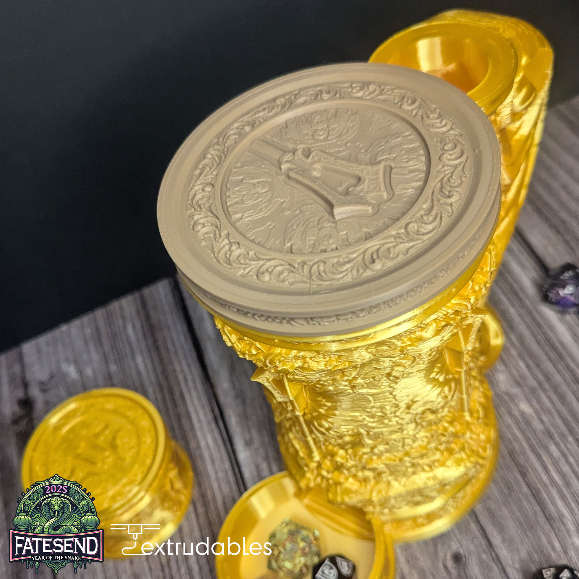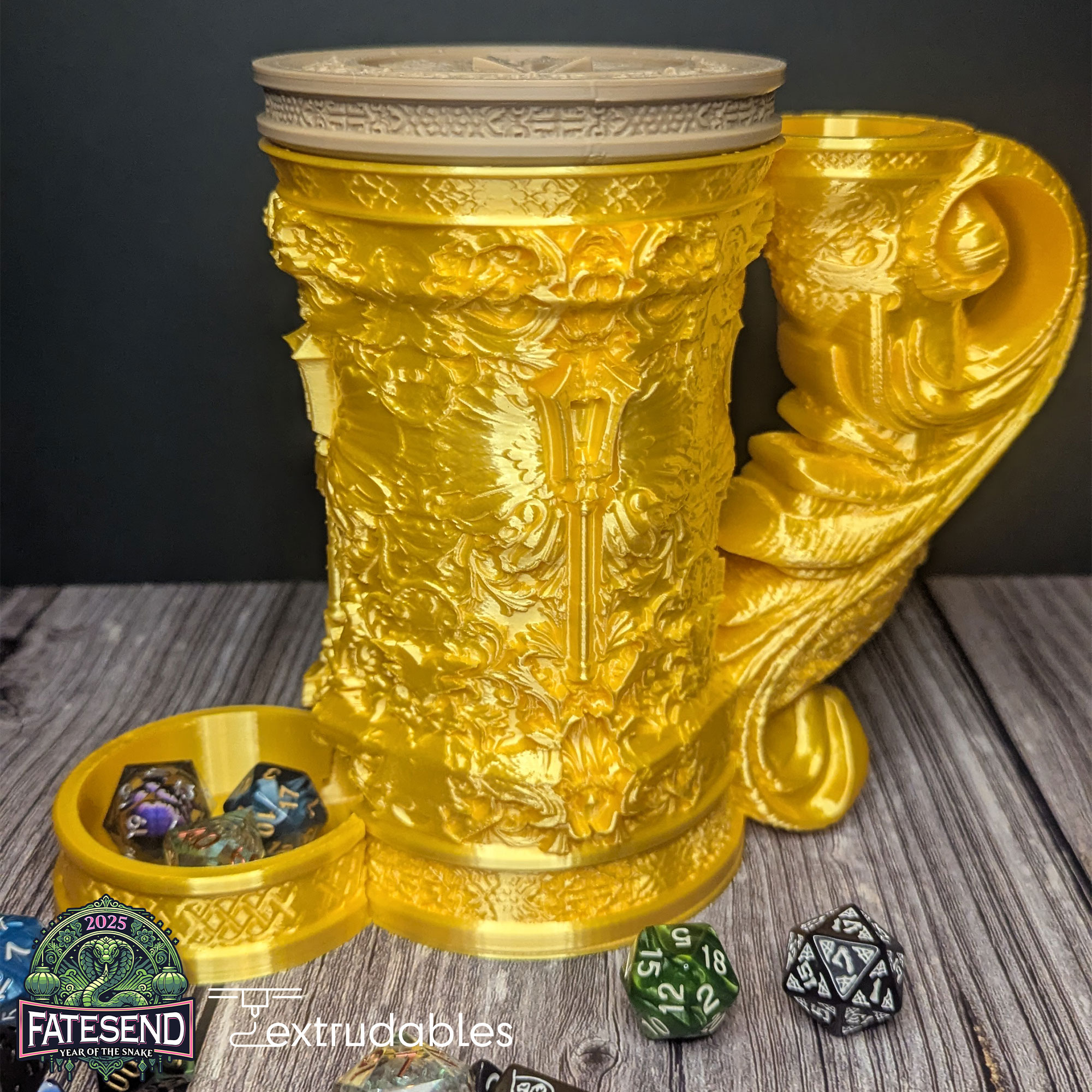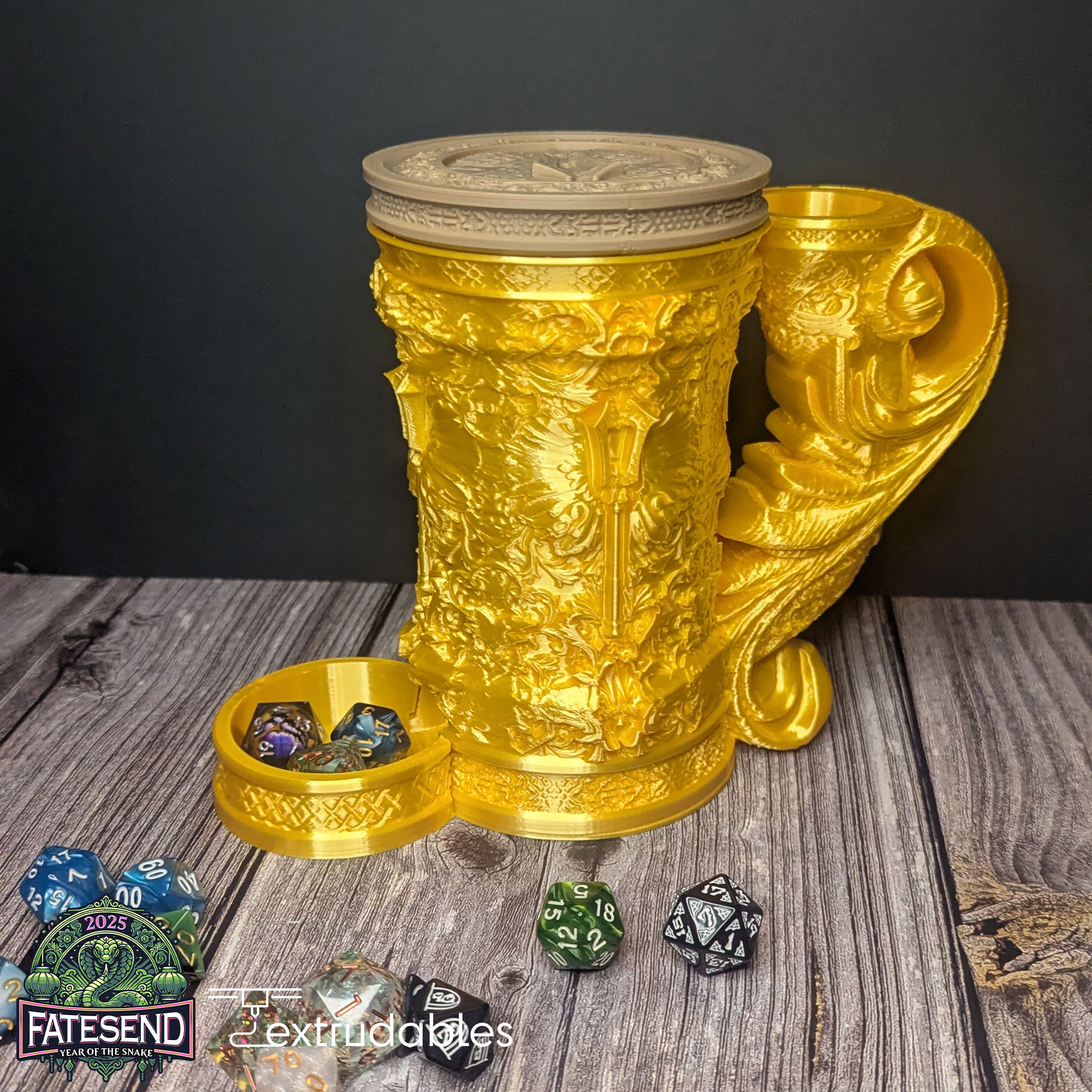 Bless your rolls and sanctify your sips with the Cleric’s Sanctified Tankard—a holy relic of both form and function. This 3D printed masterpiece is more than a sacred vessel: it’s a fully functional dice tower and a can cozy in one divine design. Whether you serve the Light, the Flame, or the Forge, this is the perfect holy tool for your tabletop crusade.