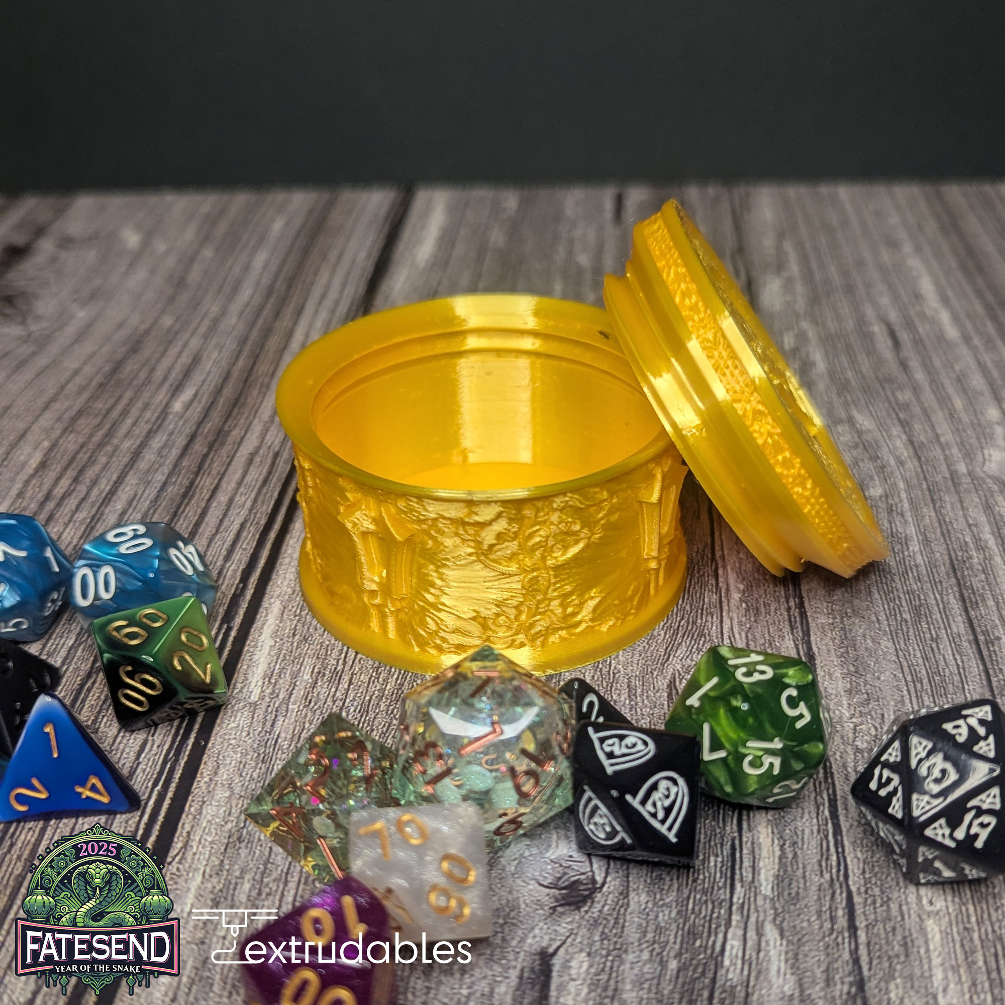 • Functional Dice Roller: Drop your dice in the top and watch them tumble out through the base—perfect rolls with a dramatic reveal.