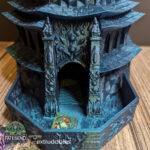- Intricate Drow Design: The dice tower is inspired by Drow architecture, with sharp, angular features and elegant, gothic detailing. It features dark stone textures, runes, and a silhouette of the dark elf race, evoking the secrets and magic of their underground cityscapes.